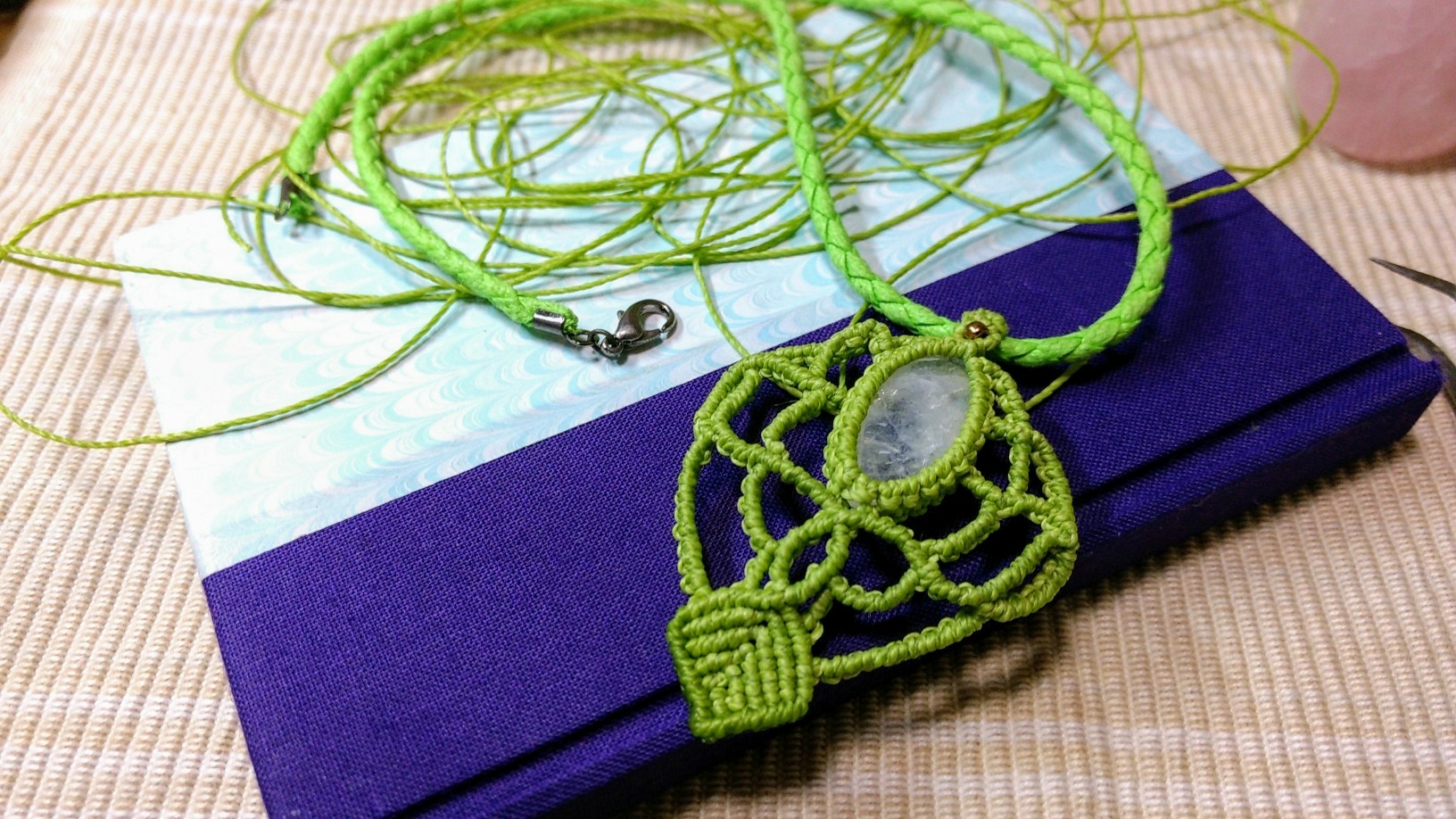 最近、フェイスブックでつながってる人の中に、ブロンズのプレートと石を使って葉っぱのモチーフを作る人を見かけることが多くて、それをマクラメにしてみたらどうなるかな~と久々に作ってみたい欲がムクムクと湧いてきたので。